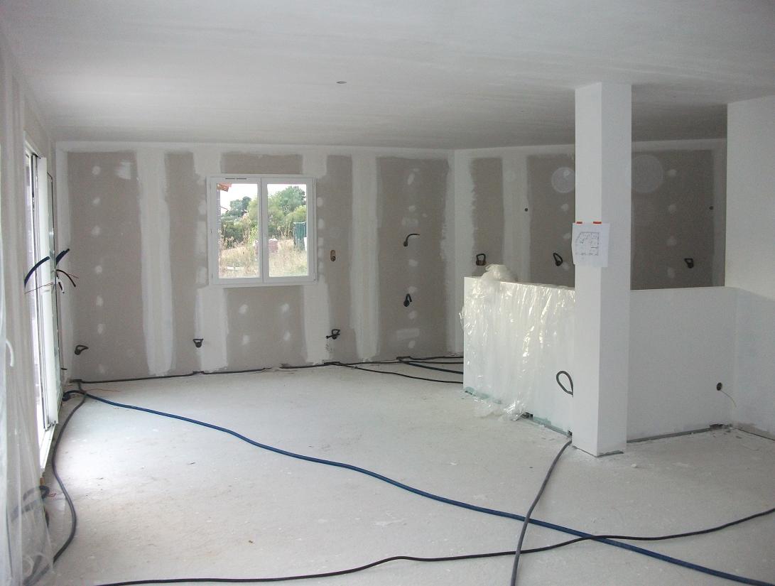 On avait des inquiétudes quant au fait que les cloisons aient été montées et fermées, les bandes de plâtre faites et poncées mais aucune gaine électrique n’avait été tirée. Le plaquiste nous avait dit que ce n’était pas un problème car l’électricien passerait par le sol. Certes on arrivait à comprendre comment il allait faire pour les prises de courant et les lumières au plafond mais on ne comprenait pas comment cela va être possible pour les interrupteurs sans abîmer l’isolation.